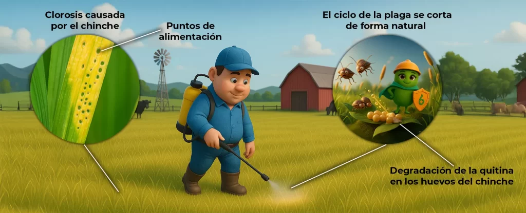 Los microorganismos benéficos proporcionan una forma de control de incidencia de plagas que opera de manera indirecta pero eficaz, transformando el entorno en un espacio menos favorable para que las plagas se reproduzcan y se alimenten. A través de su acción sobre el suelo y las plantas, estas bacterias generan un ambiente desfavorable para los insectos dañinos dificultando su desarrollo a través de la deshidratación de huevos, larvas e instares 1 y 2 disminuyendo su presencia sin recurrir a pesticidas químicos.